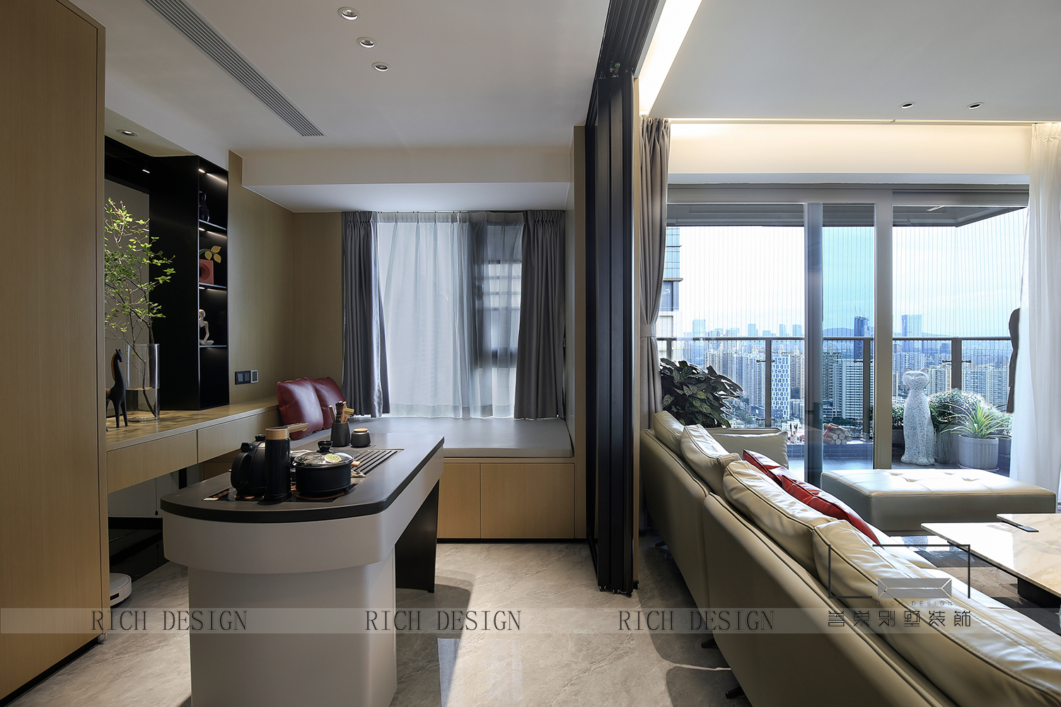 以光為引,納景為畫,融現代簡約與東方禪意,打造可游可居的詩意棲所。天然木石肌理與弧形家具相映,在留白中勾勒溫暖;通透界面消弭內外界限,讓庭院綠意、流水聲與室內琴聲、書香自由對話。最終在光影流動間,成就一座會呼吸的生活劇場。